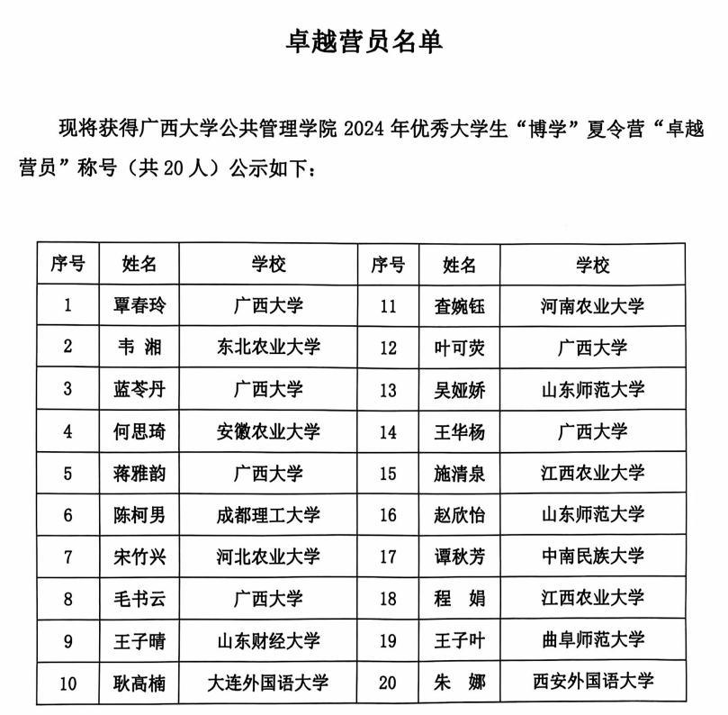 在丰富多彩的夏令营活动中,营员们各有所获。经夏令营组委会综合评定,本次共有覃春玲等20名同学被评为卓越营员,由覃志敏代表夏令营组委会宣读本届优秀大学生“博学”夏令营卓越营员名单。