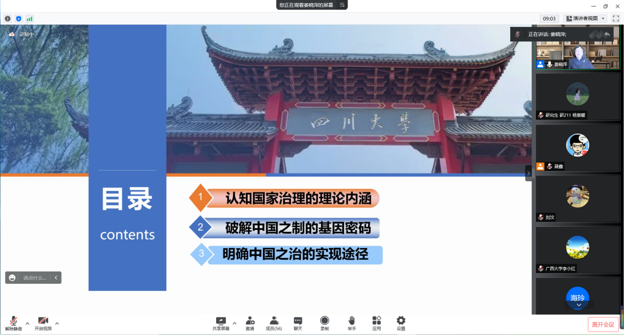 首先,姜教授通过中西方对于治理问题的研究向大家明确国家治理就是在中国特色社会主义道路的既定方向上,在中国特色社会主义理论的话语语境和话语系统中,在中国特色社会主义制度的完善和发展的改革意义上,中国共产党领导人民科学、民主、依法和有效地治国理政,并指出要领悟国家治理的根本遵循、厘清国家治理体系和治理能力的内在逻辑和聚焦国家治理的核心问题等。接着,姜教授从制度的力量、制度的谱系、制度的源流和我国制度的优势等方面向大家阐述中国特色社会主义制度。最后,姜教授指出实现中国之治的路径有:实现构建多维立体“大党建”格局、完善科学严谨“大党建”机制和创新城乡“党建+”体系、坚持人民至上、坚持三共融三治、坚持依法治国、倡导回应性治理、提升治理韧性和加快建设数字政府等方面。